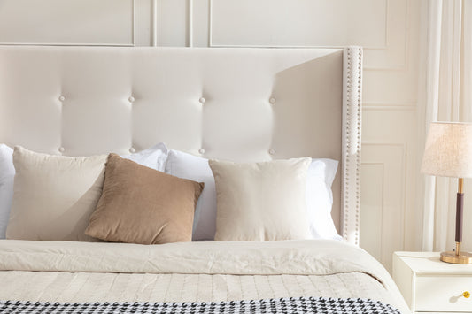 Peyton Upholstered Queen Bed / 54' High Headboard / Traditional Hand Buttoned Tufting / Nailhead Trim Wingback / No Box Spring Needed / Easy Assembly / Ivory Velvet B083P152026