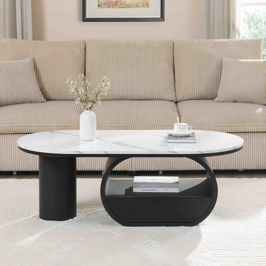 Luxury Modern Oval Coffee Table, 47.24'' Coffee Table with Storage Drawer, Faux Marble Top, Black Metal Center Table for Living Room W821S00031