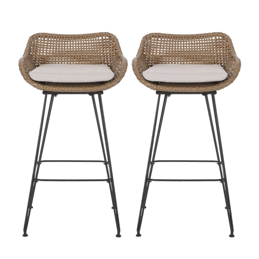 29.25' Outdoor Wicker and Iron Low Back Barstools, Light Brown, with Beige Cushion (Set of 2) 71503.00LBRN