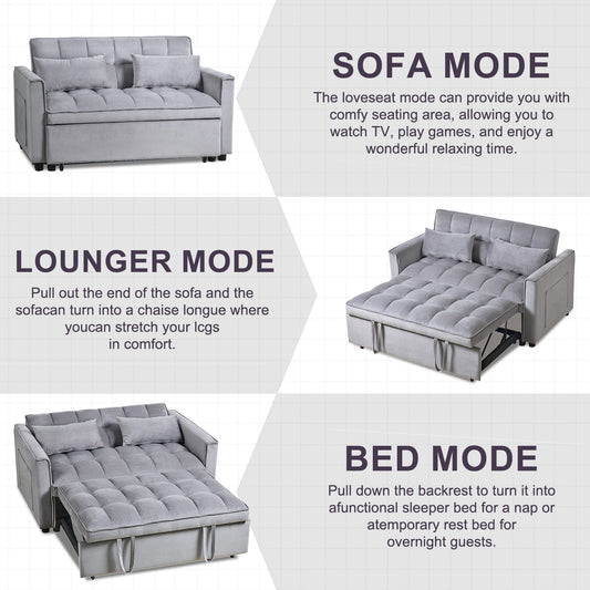 3 in 1 Convertible Sleeper Sofa Bed, Modern Pull Out Couch Bed, Adjustable Backrest, Velvet Loveseat Futon Sofa with Pillows & Pockets for Living Room Apartment, Grey W2121P179225