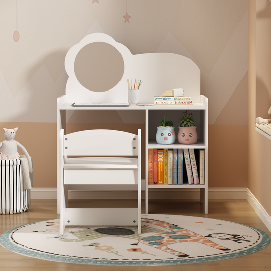 Kids Vanity Table with Mirror and Chair, Wooden Children's Dressing Makeup Desk with Storage Shelves, Study and Activity Table for Girls and Boys, Playroom Bedroom Furniture - White W808P346014