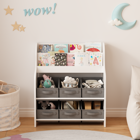 Kids Bookshelf with 6 Fabric Storage Bins, Multi-Functional Children's Bookcase and Toy Organizer in White & Gray, MDF Construction, 24.8 x 11.8 x 27.95 inches W808P346015