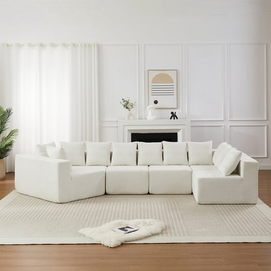 135.4' 6-Piece U-Shaped Sleeper Modular Sectional Sofa Bed Chaise, Oversized 4-Seater Boneless Convertible Block Cloud Tufted Floor Corner Couch Set with 2 Ottomans & 4 Pillows for Living Room, Ivory W3118S00022