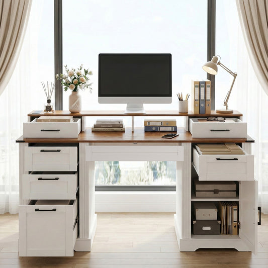 Modern Home Office Table,Expandable Desk with Storage Drawers & Open Shelf,Computer Desk with Hutch & Bookshelf,Wood Executive Desk Teens Student Desk Writing Laptop Home Office Desk W1321P359251