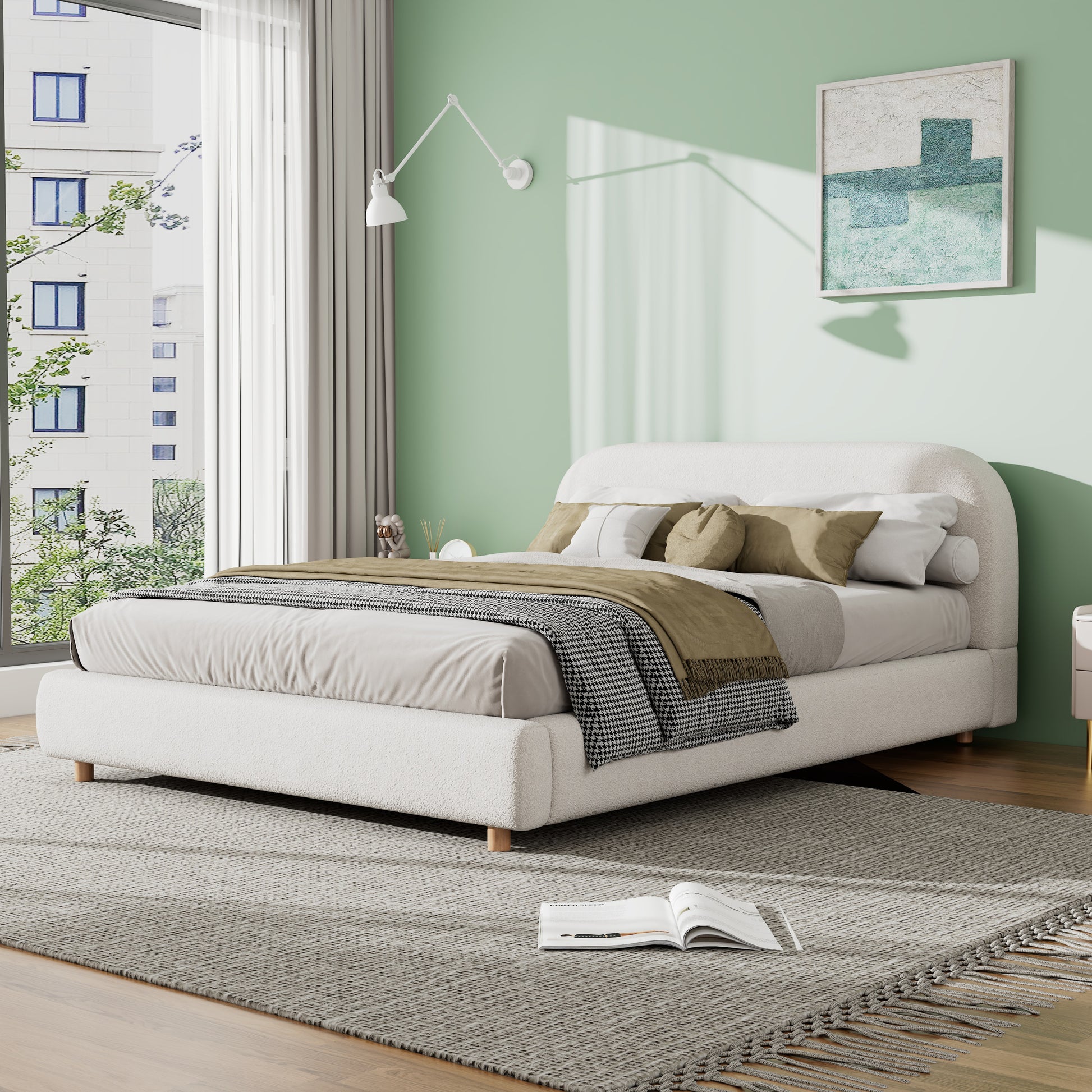 Queen Size Upholstered Bed With Boucle Fabric,Curved-Shape Design Thick Headboard, Solid Wood Legs,White N757Q210312W-1