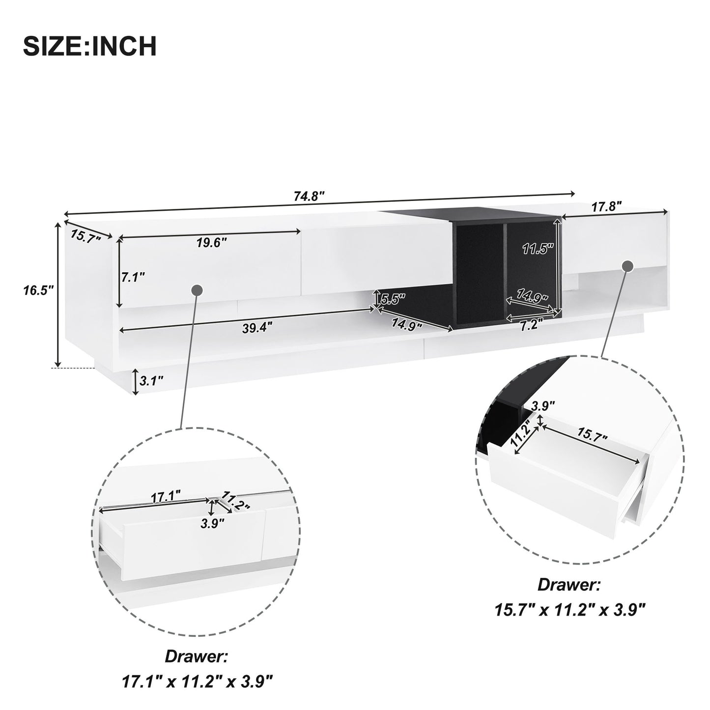 Detailed Measurement | Overall: 74.8''W x 15.7''D x 16.5''H / Right Side Drawer: 15.7''W x 11.2''D x 3.9''H / Left Side Drawer: 17.1''W x 11.2''D x 3.9''H |