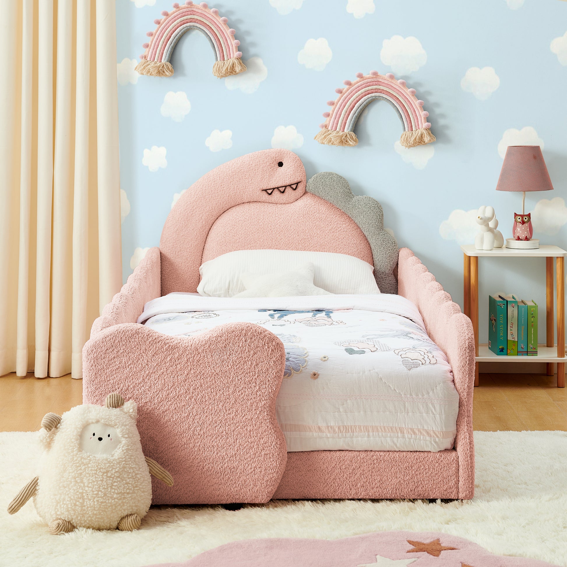 Twin Size Cute Dinosaur-Shaped Kids Bed with Safety Guardraild, Solid Wood Toddler Bed Frame for Children for Bedroom, Boucle Fabric W1413P384917
