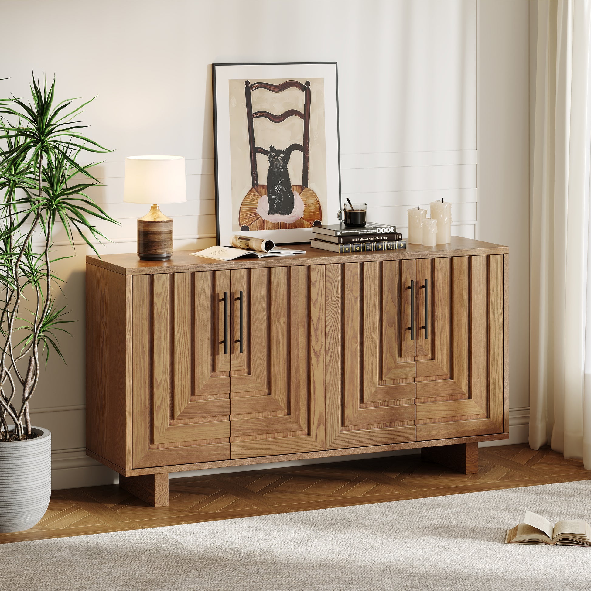Modern sideboard, 59''×15.75''×32.5'' storage cabinet with 4 doors, MDF and ash veneer with metal handles, natural finish, suitable for dining/living room storage N780P352310N